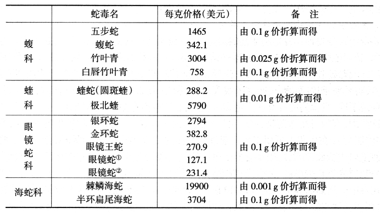 随着生产蛇毒的国家和地区的增加,蛇毒的价格在国际上也不免或升或降。但就笔者查阅美国SIGMA化学公司多年来出的每年一厚册的售品价格,蛇毒的价格或升或稳,从未出现过下跌趋势。